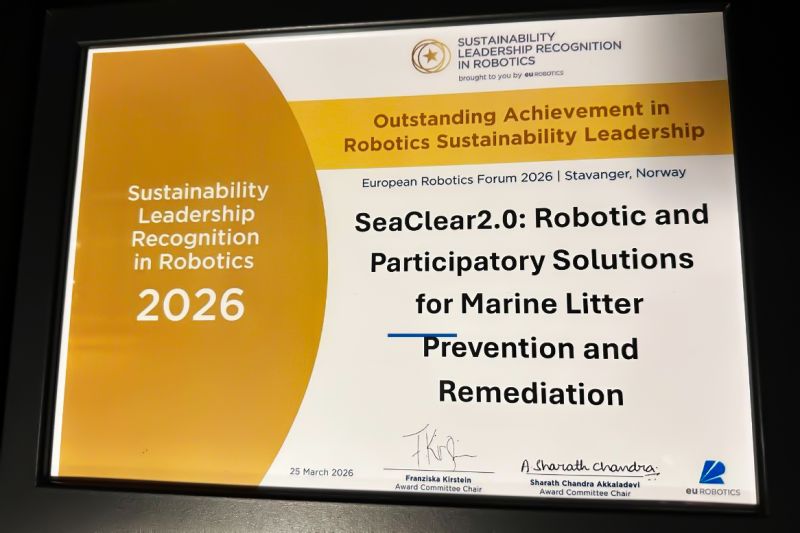 The SeaClear 2.0 project, of which Subsea Tech is a partner, received this award at the European Robotics Forum 2026 in Stavanger. Our SeaCAT, Mini TORTUGA, and TORTUGA robots are at the heart of the project, enabling autonomous detection and collection of underwater litter.